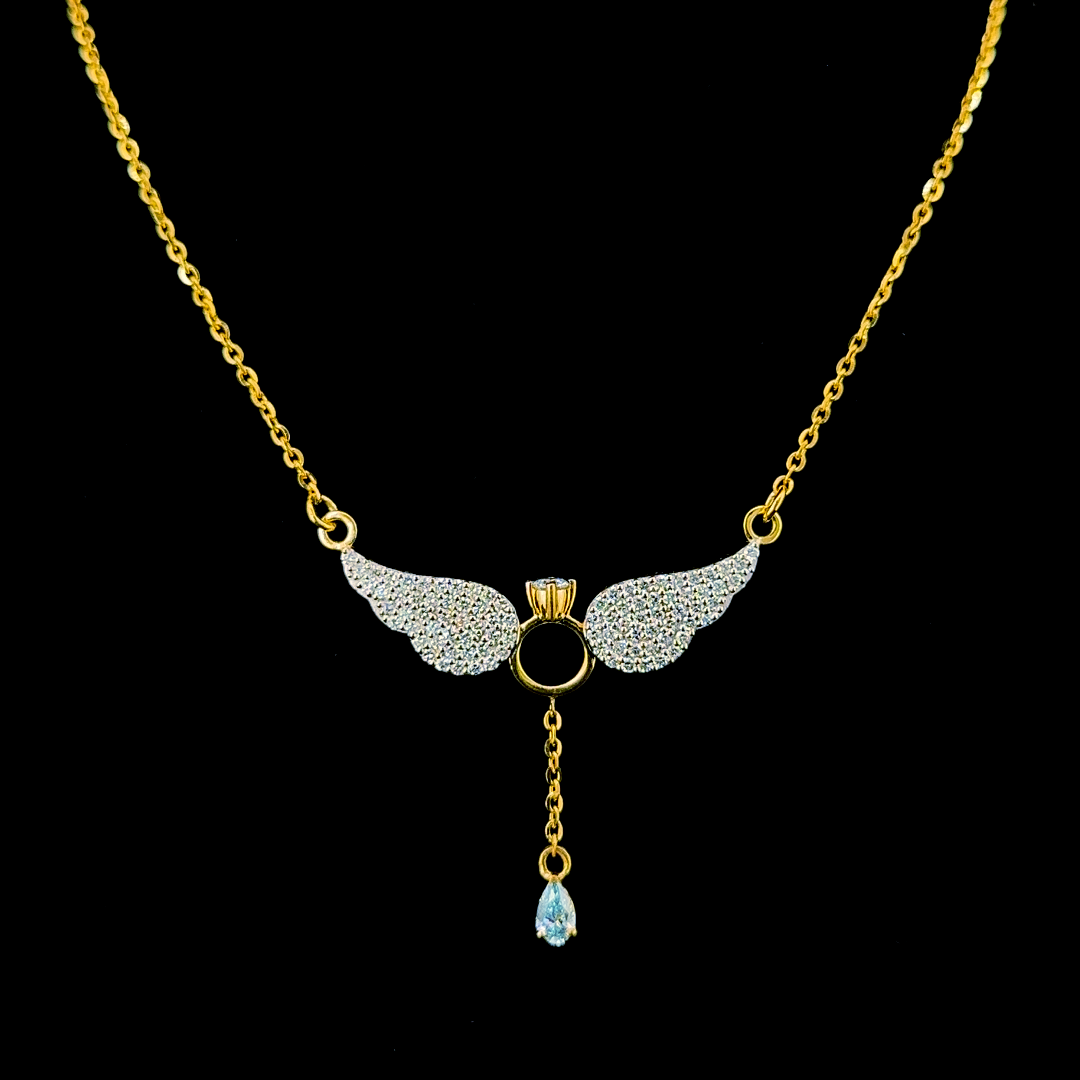 Angel Wings & Diamond Ring Drop Gold Pendant Necklace