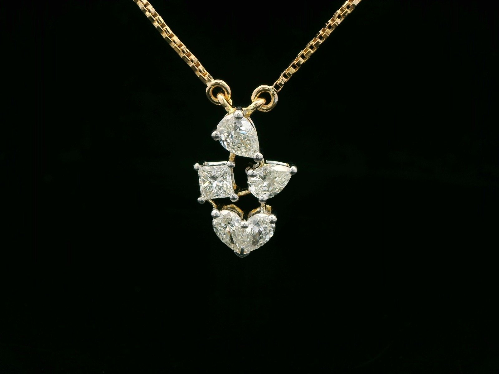 Crafted in radiant 18K Yellow Gold, this pendant is a true work of modern artistry. It features an exquisite cluster arrangement of four individually cut natural diamonds, each contributing its own unique brilliance: