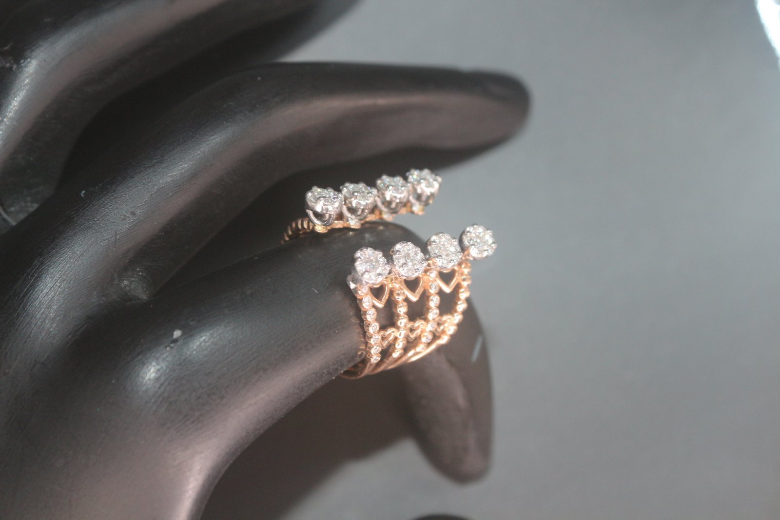 The ring’s structure is highly unique, featuring an intricate, vine-like or mesh openwork band that gives the piece texture and a light, airy feel. This intricate base supports two floating rows of dazzling diamond clusters, each cluster formed by several brilliant-cut Natural Diamonds set closely together to maximize sparkle and create the look of a larger single stone.