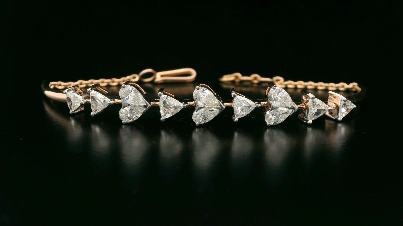 Express eternal devotion with The Adore Heart Diamond Chain Bracelet, a uniquely romantic piece from Muddra Diamond Jewellery. This bracelet moves beyond the traditional, featuring a striking sequence of seven dazzling, perfectly matched Heart-Shaped Diamonds (or specialized trillion cuts that resemble hearts/chevrons).