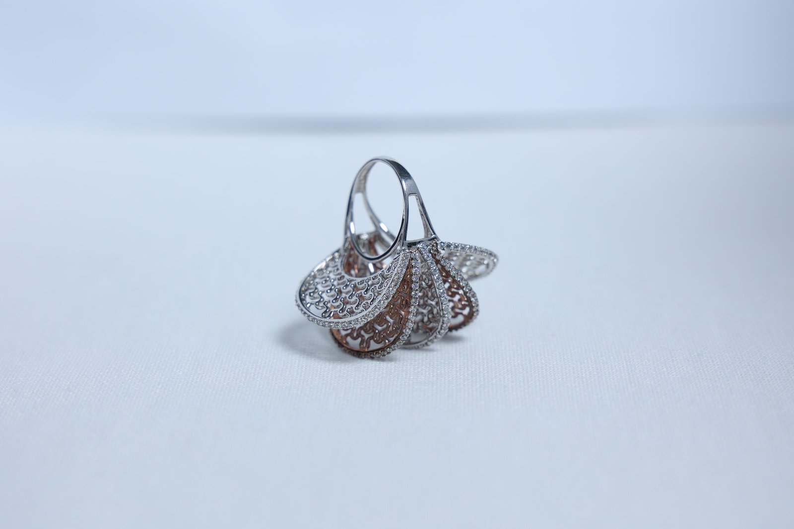The petals are intricately crafted using delicate Filigree and Milgrain detailing in contrasting White Gold and warm Rose Gold, giving the piece depth and texture. The edges of the petals are lavishly outlined and filled with sparkling pavé-set white diamonds, maximizing brilliance without feeling overly heavy.